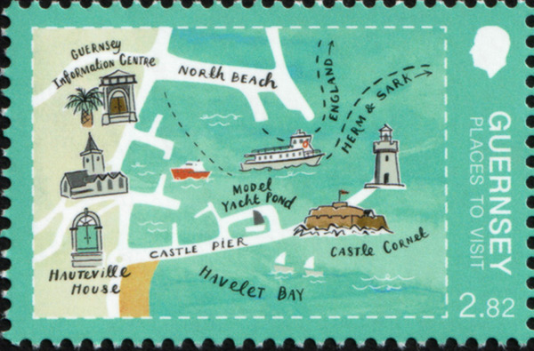 On 23 April 2025 Guernsey issued a set of four stamps showing “Places to Visit”. One of these stamps shows a stylized view of Castle Breakwater Lighthouse located at St. Peter Port on the end of the breakwater.